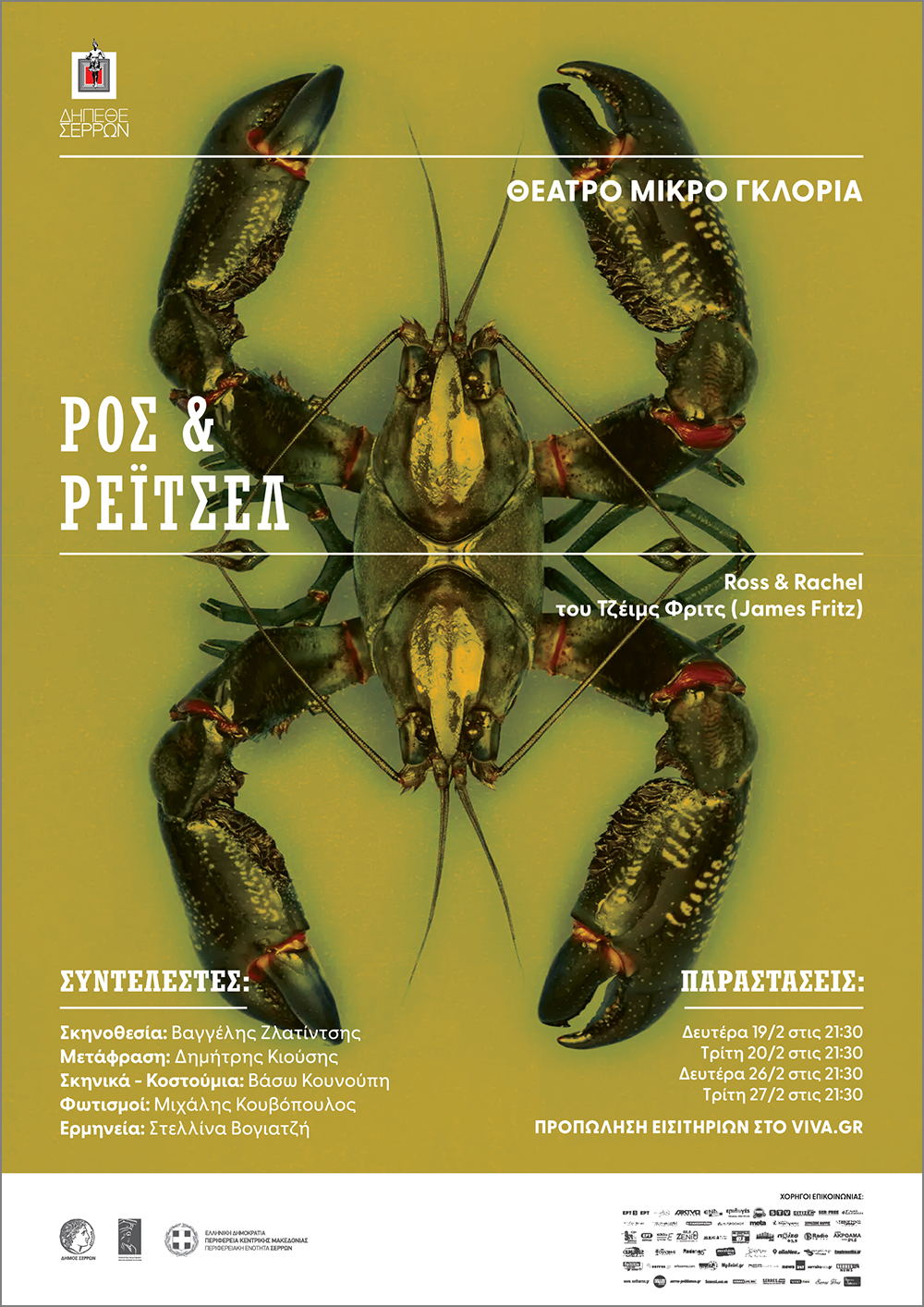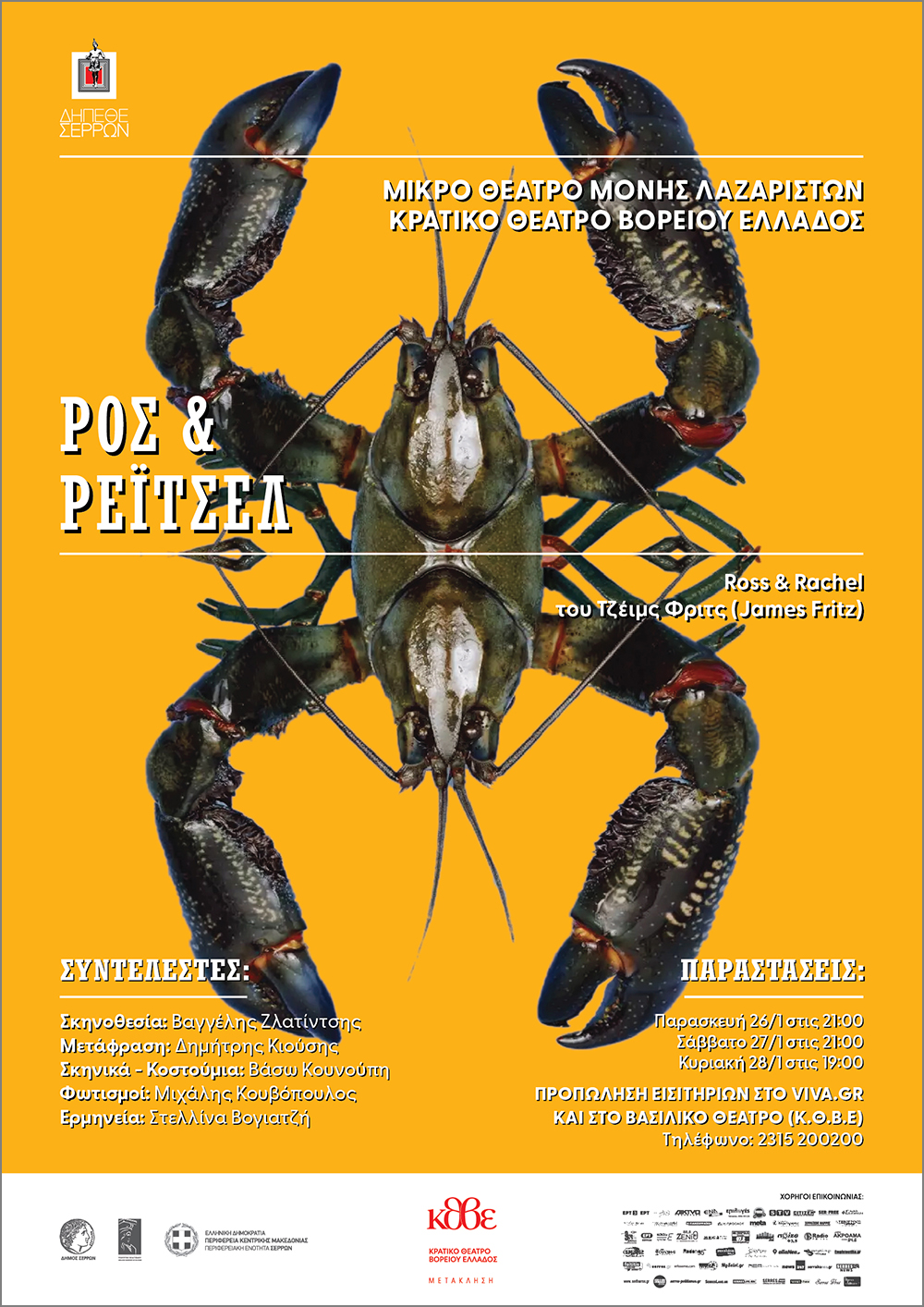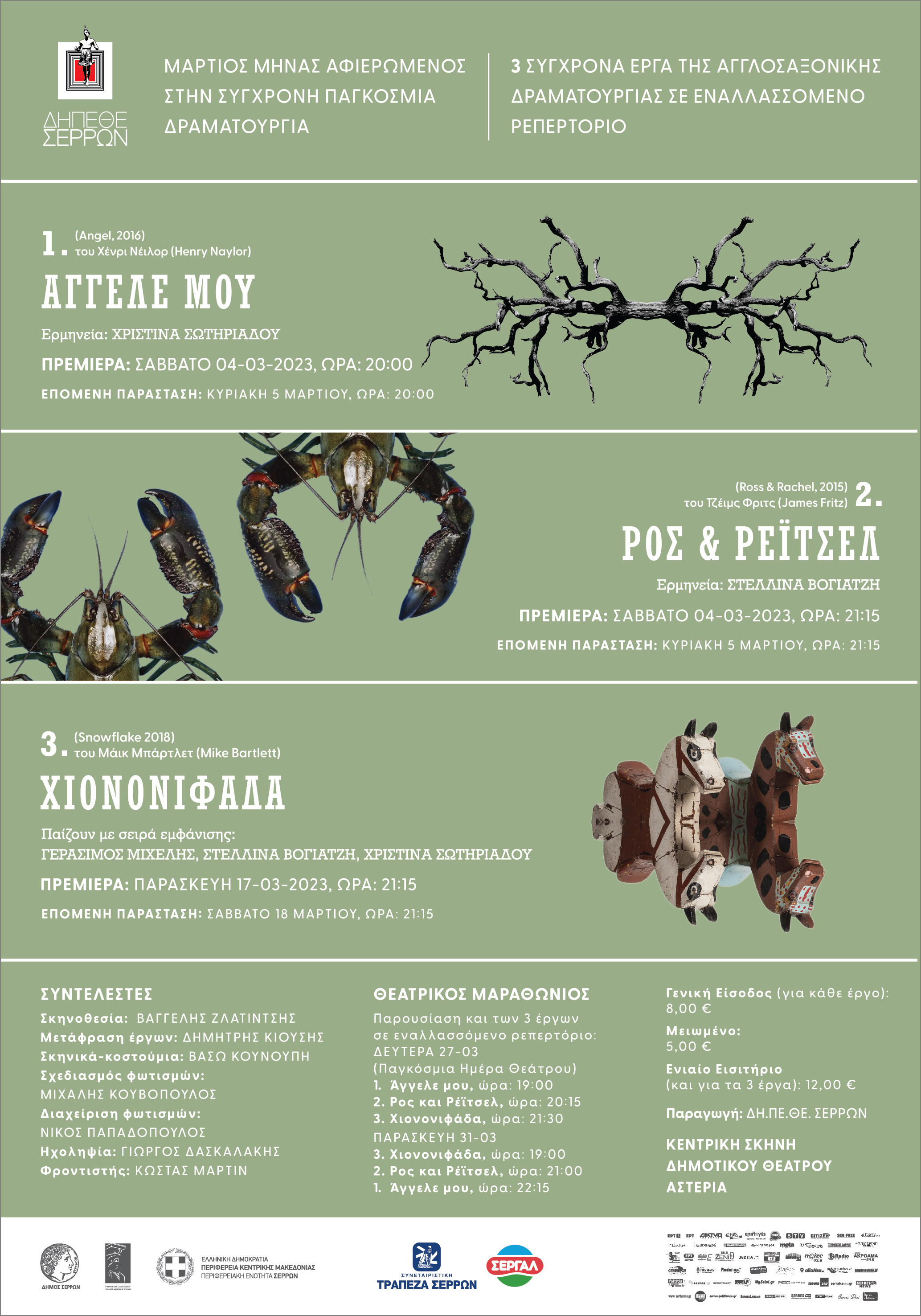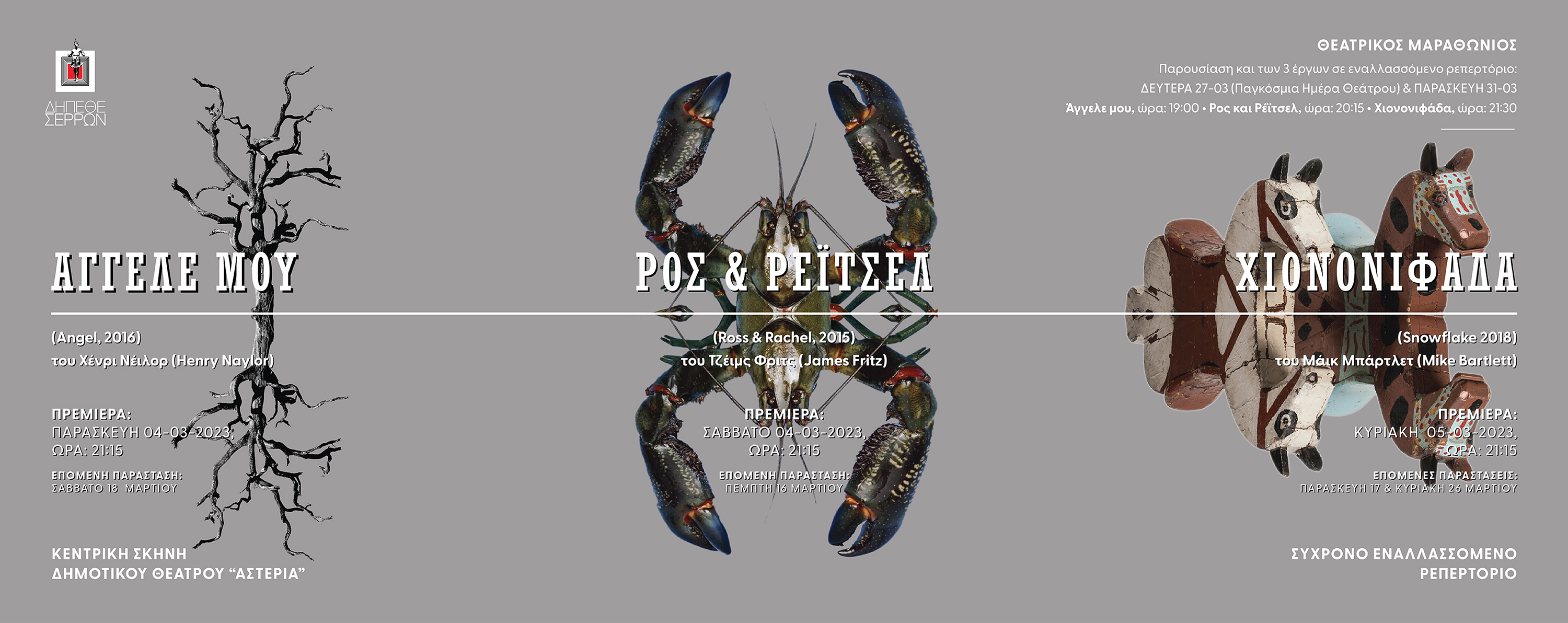 Δημιουργικό αφίσας για 3 θεατρικά έργα. "Άγγελε μου" (Henry Taylor), "Ρος και Ρέιτσελ" (James Fritz), "Χιονονιφάδα" (Mike Bartlett). Σκηνοθεσία: Βαγγέλης Ζλατίντσης. Λόγω της μεγάλης του απήχησης, το έργο "Ρος και Ρέιτσελ" ανέβηκε σε επανάληψη για μετρημένες παραστάσεις σε επιλεγμένους θεατρικούς χώρους.
