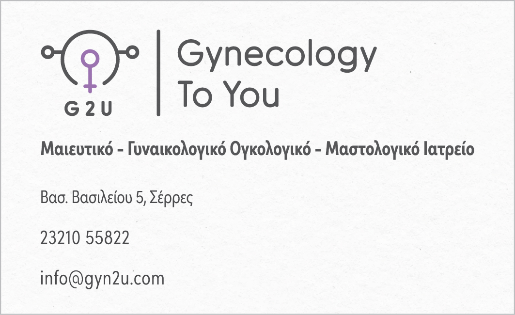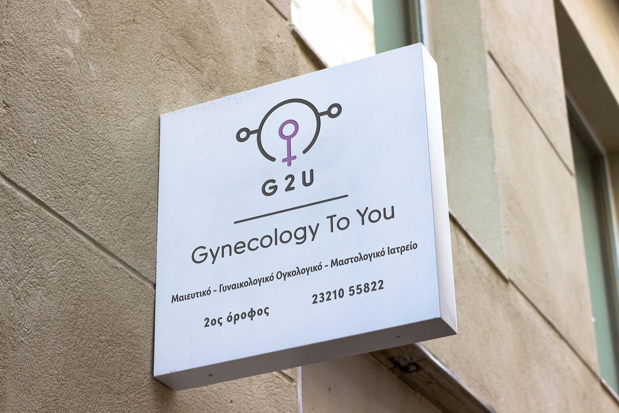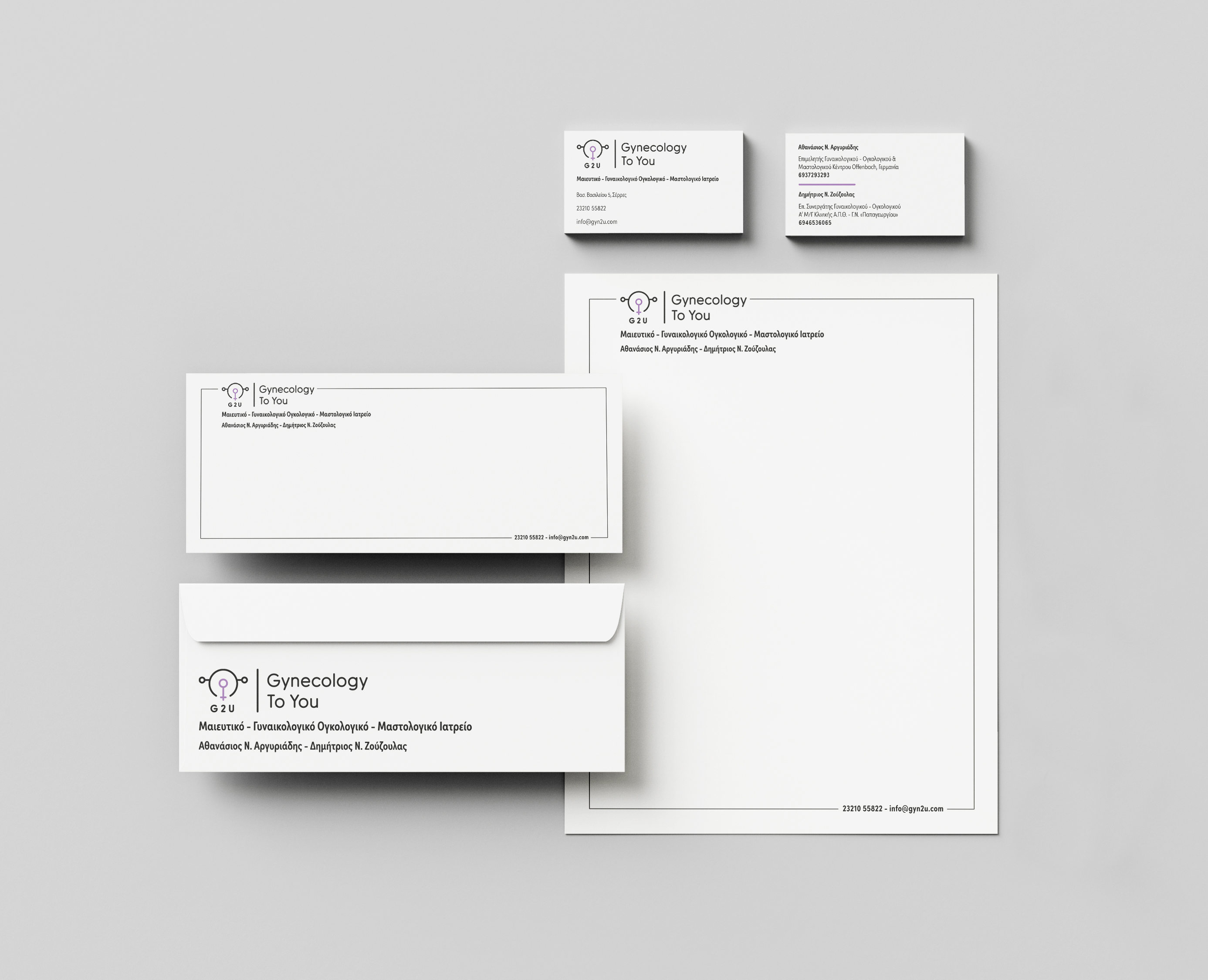 Εταιρική ταυτότητα για το γυναικολογικό ιατρείο του Θάνου Αργυριάδη και Δημήτρη Ζούζουλα με την επωνυμία gynecology to you (G2U). Το λογότυπο συνδυάζει το θηλυκό σύμβολο ♀ με μια σχεδιαστική σχηματοποίηση του γεννητικού συστήματος της γυναίκας. Ο σχεδιασμός του σήματος και η επιλογή γραμματοσειράς έγιναν με γνώμονα την αίσθηση της καμπυλότητας η οποία προσδίδει φιλικότητα και ασφάλεια.