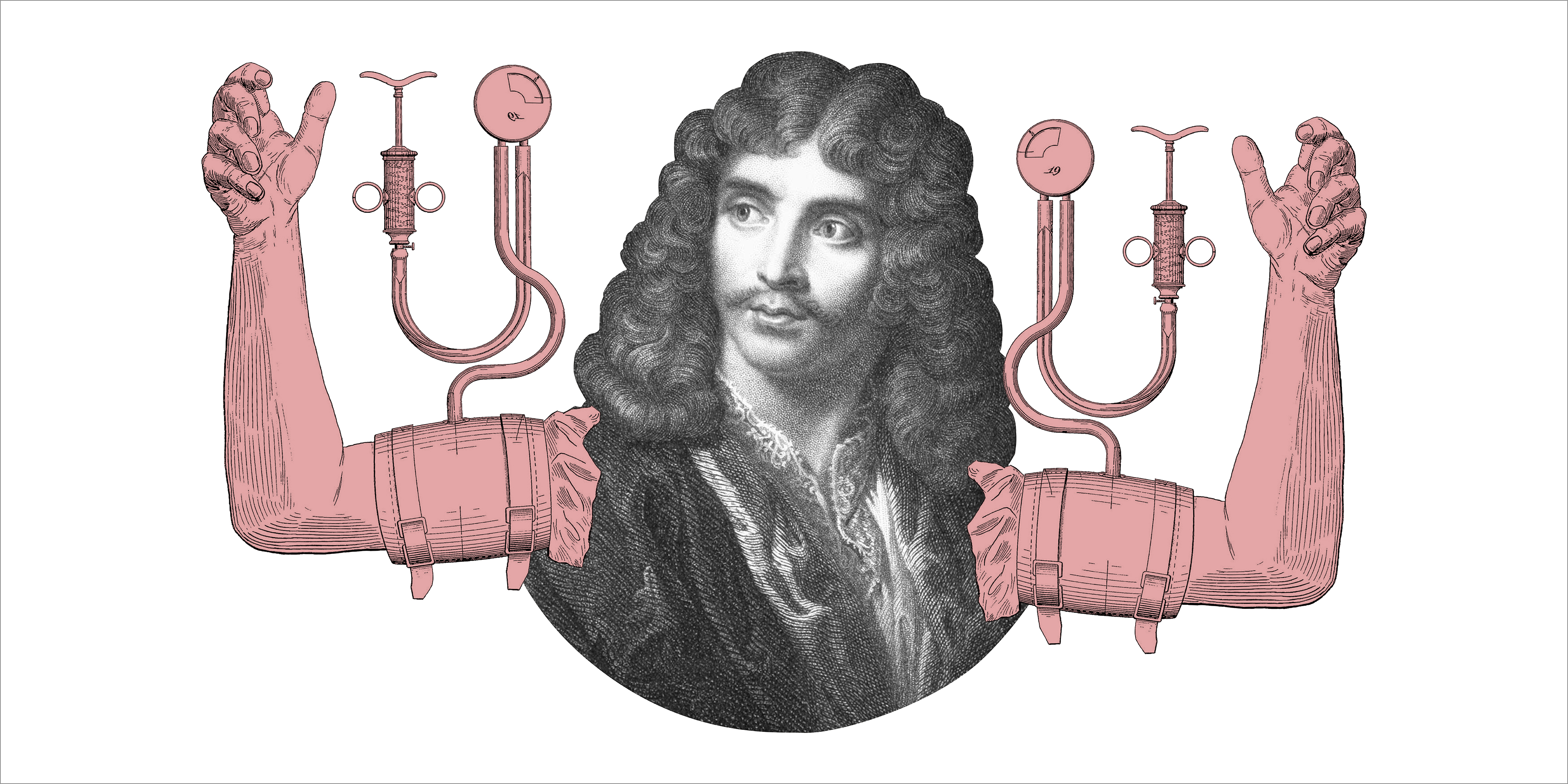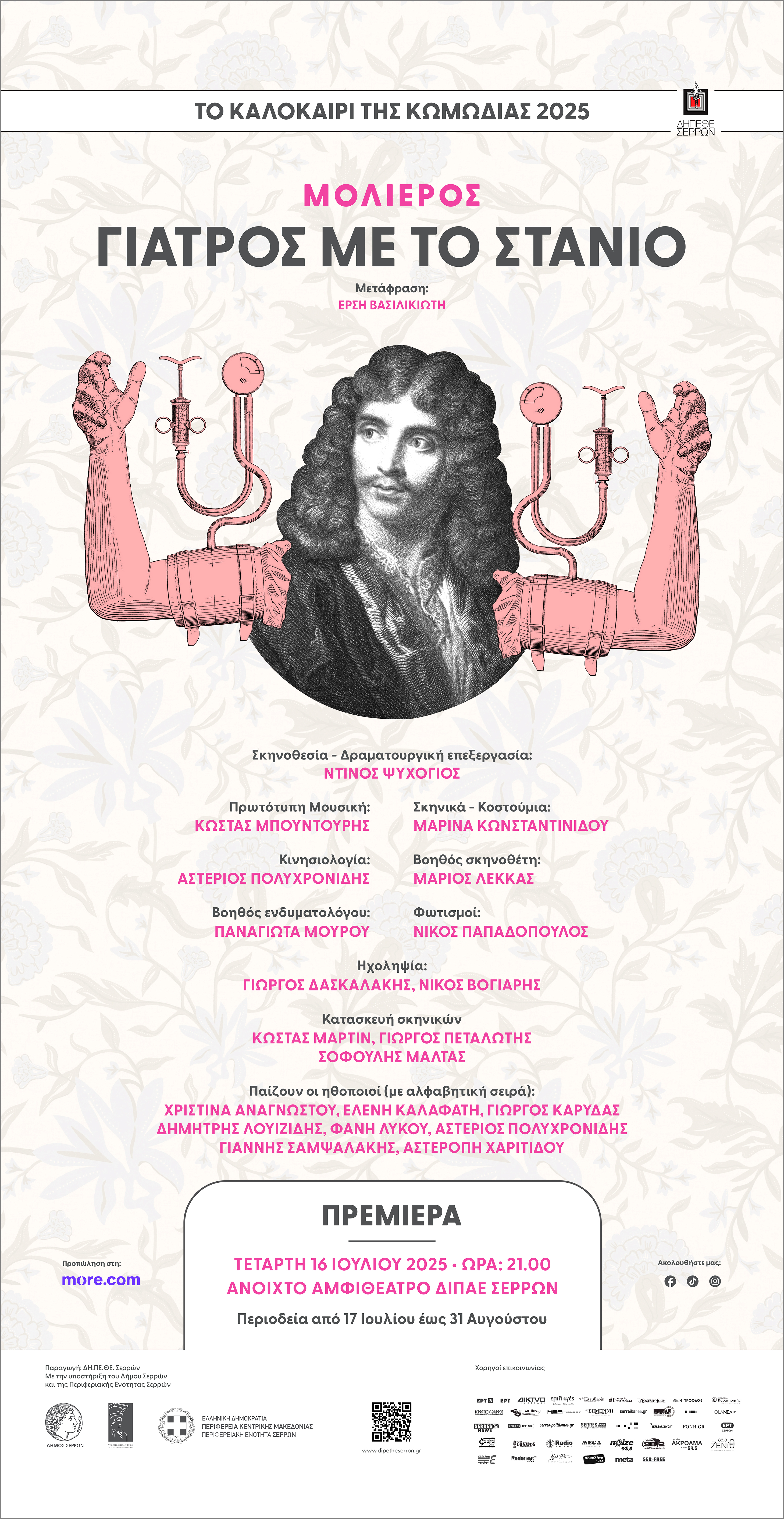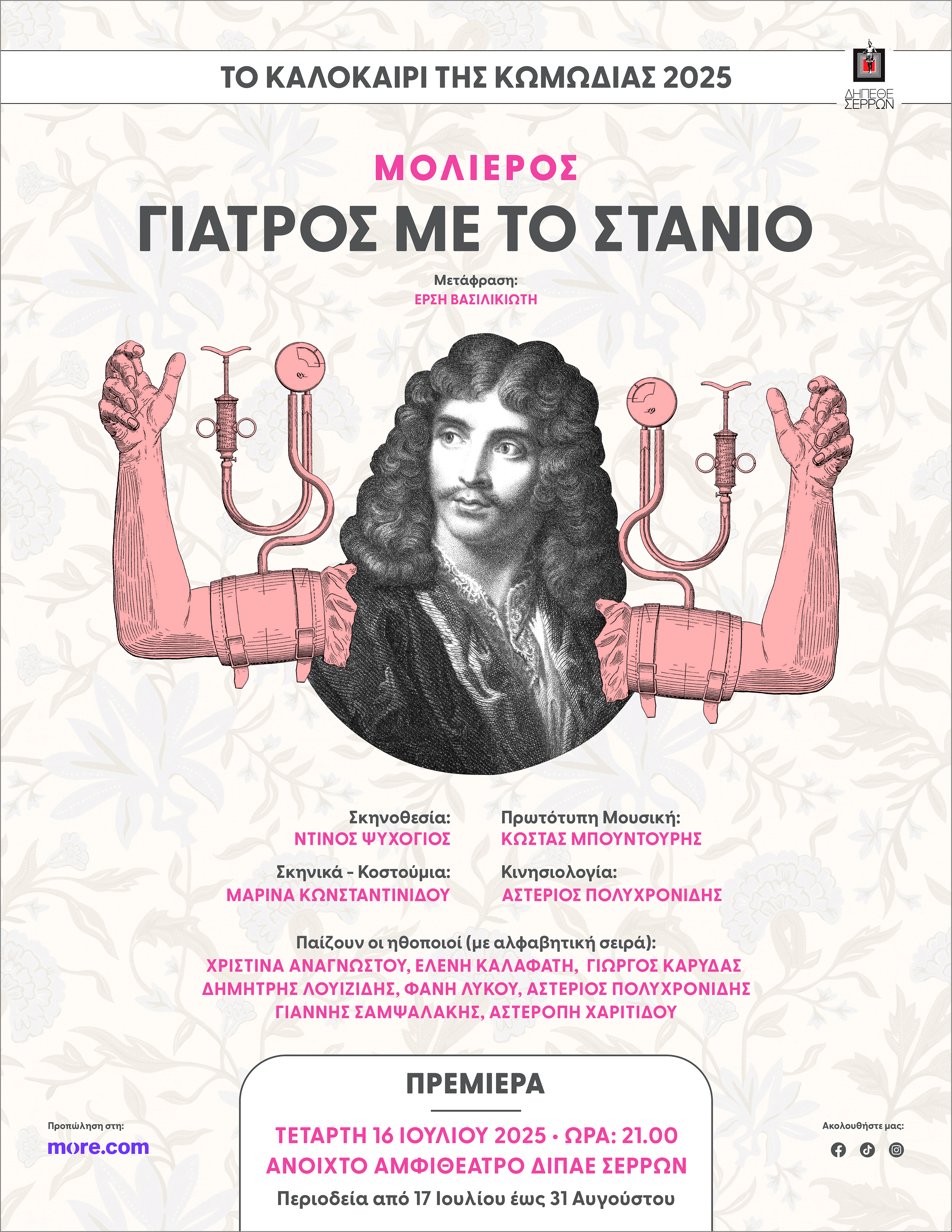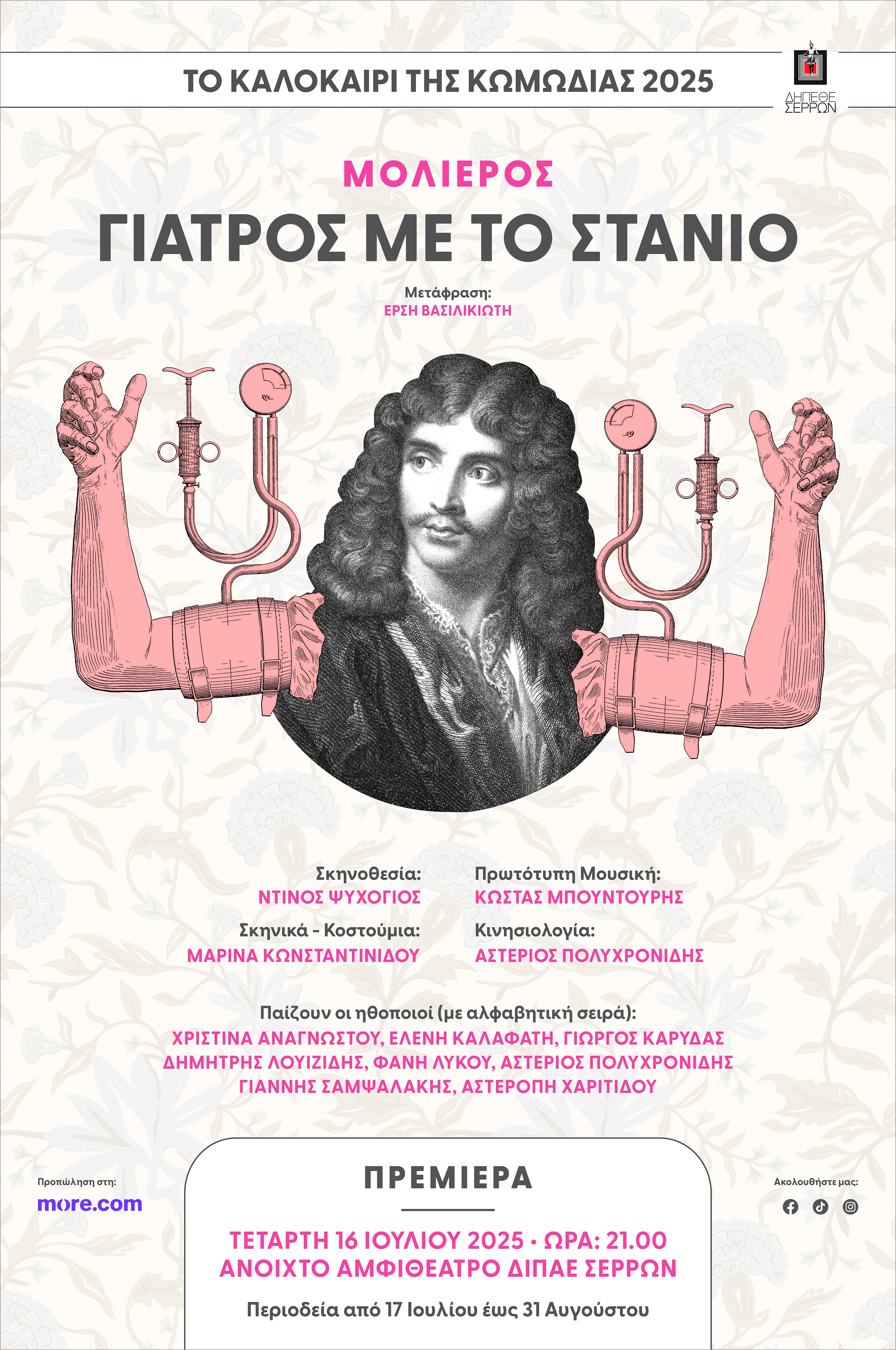 Δημιουργικό αφίσας για τη θεατρική παράσταση "Γιατρός με το στανιό" του Μολιέρου.